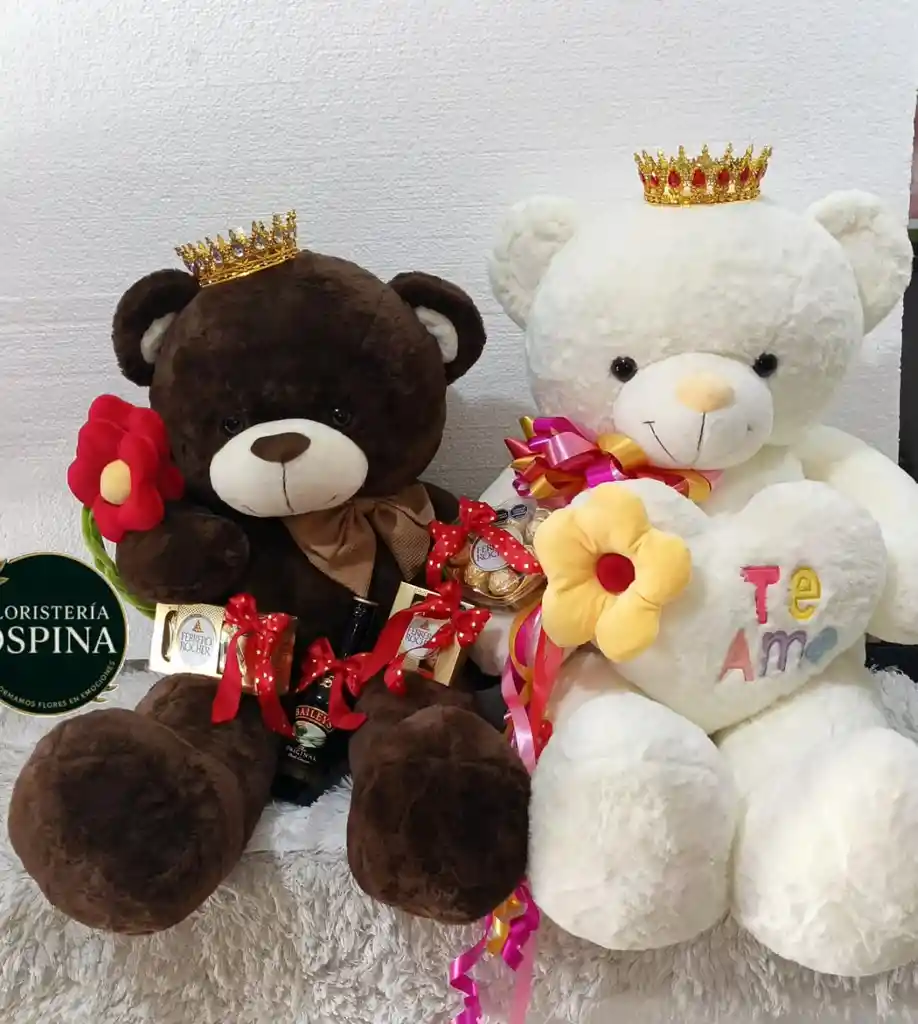 Una pareja encantadora que roba miradas y derrite corazones 💞. Nuestros ositos coronados son símbolo de dulzura y complicidad: él, elegante y conquistador con su moño de terciopelo y detalles de chocolate; ella, tierna y romántica con su corazón bordado en “Te Amo”. Un dúo perfecto para expresar amor con estilo y un toque de picardía. Ideal para celebrar aniversarios, fechas especiales o simplemente para sorprender a quien ilumina tu vida. 👑 Disponible en Floristería Ospina, donde transformamos flores en emociones. 🌷💫