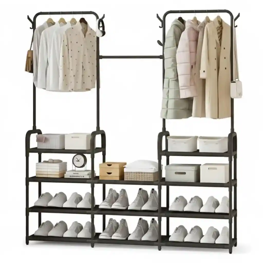 Perchero Organizador Multifuncional Metálico Negro con Zapatero y Estantes Este perchero organizador multifuncional de estructura metálica en color negro está diseñado para maximizar el almacenamiento en espacios reducidos, combinando de forma práctica áreas para colgar ropa, estantes para cajas y múltiples niveles para calzado. Su estilo industrial y minimalista lo convierte en una solución elegante y funcional para dormitorios, entradas y vestidores. Especificaciones del Producto Tipo: Perchero organizador multifuncional Material: Estructura metálica (tubería de acero o metal reforzado) Color: Negro mate Estilo: Industrial / Minimalista Uso recomendado: Dormitorio, vestidor, entrada del hogar Dimensiones Alto: 164 cm Ancho: 137 cm Profundidad: 26 cm Características Principales Zona de Colgado – Parte Superior Dos barras superiores independientes: Permiten colgar camisas, chaquetas, vestidos, abrigos y otras prendas largas. Ganchos laterales tipo “rama”: Ideales para bolsos, mochilas, sombreros, bufandas y accesorios. Barra central de refuerzo: Aporta mayor estabilidad estructural y permite colgar prendas más cortas. Estantes Intermedios Superficies planas de almacenamiento: Perfectas para cajas organizadoras, cestas de mimbre, bolsos, libros, relojes u objetos decorativos. Zapatero Inferior 4 niveles de estantes a lo largo de todo el mueble: Capacidad aproximada para 12 a 15 pares de zapatos, según el tamaño del calzado. Contenido del Paquete Cantidad: 1 perchero organizador multifuncional Estructura metálica desmontable Barras de colgado, estantes y zapatero Accesorios de montaje Garantía y Derecho de Retracto Garantía: 30 días por defectos de fabricación. Derecho de retracto: 5 días hábiles desde la entrega del producto. Nota Importante Para aplicar garantía o retracto se deben enviar fotos y/o videos que evidencien claramente el estado del producto. La garantía no cubre daños por golpes, humedad, mal uso o manipulación indebida.