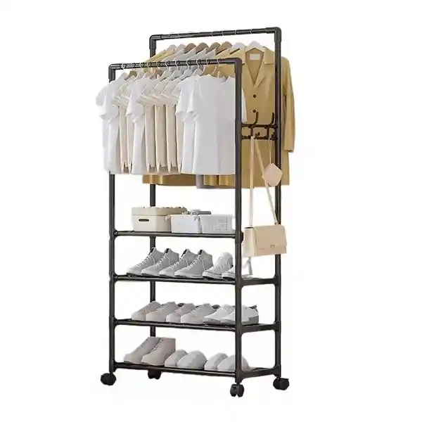 Aprovecha al máximo tu espacio con este perchero multifuncional de gran capacidad, diseñado para combinar almacenamiento de ropa y calzado en un solo lugar. Su estructura incluye una barra colgante para prendas y cuatro estantes inferiores ideales para zapatos, cajas u otros accesorios, permitiéndote organizar todo de manera eficiente. Con un diseño moderno y elegante, se adapta perfectamente a cualquier habitación, entrada, balcón o lavandería, manteniendo tu hogar ordenado y limpio. Fabricado con materiales de alta calidad, garantiza estabilidad, resistencia y durabilidad, mientras que su recubrimiento en polvo mejora la protección contra la corrosión. Además, cuenta con ruedas para facilitar su movilidad y su instalación es rápida y sencilla gracias a las herramientas y manual incluidos. Ficha Técnica: Material: Plastico - Aluminio El producto se entrega desarmado. Tamaño: 188 cm x 60 x 30 cm Para defectos de fábrica o retractos: Por favor revise el producto apenas lo reciba y antes de usarlo. No aplican ley de retracto o defectos de fábrica luego de usar el producto. Se manejan máximo 5 días para reportar defectos de fábrica (por ejemplo, producto funciona mal, piezas faltantes, rotas, etc). Para hacer efectiva la devolución el producto debe devolverse con el empaque original, el cual debe estar en buen estado, incluir todos los documentos y las partes completas y sin daños.