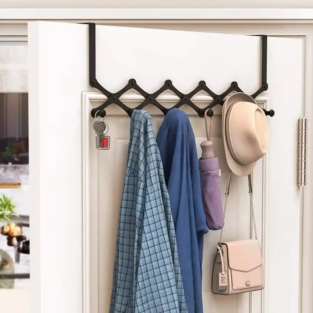 Nombre, gancho detrás de la puerta Color: negro Material, aleación de acero al carbono Tamaño 13 cm alto y expande a 40 cm de largo Número de ganchos: 5 Artesanía, pintura negra Método de instalación, sin perforar Longitud escalable, 12-40 cm Ocasiones de uso, dormitorio, sala de estar, puerta de entrada, etc. Características del producto, gancho retráctil multifuncional para ropa, gran capacidad de carga, sin caídas, sin perforaciones, listo para usar.
