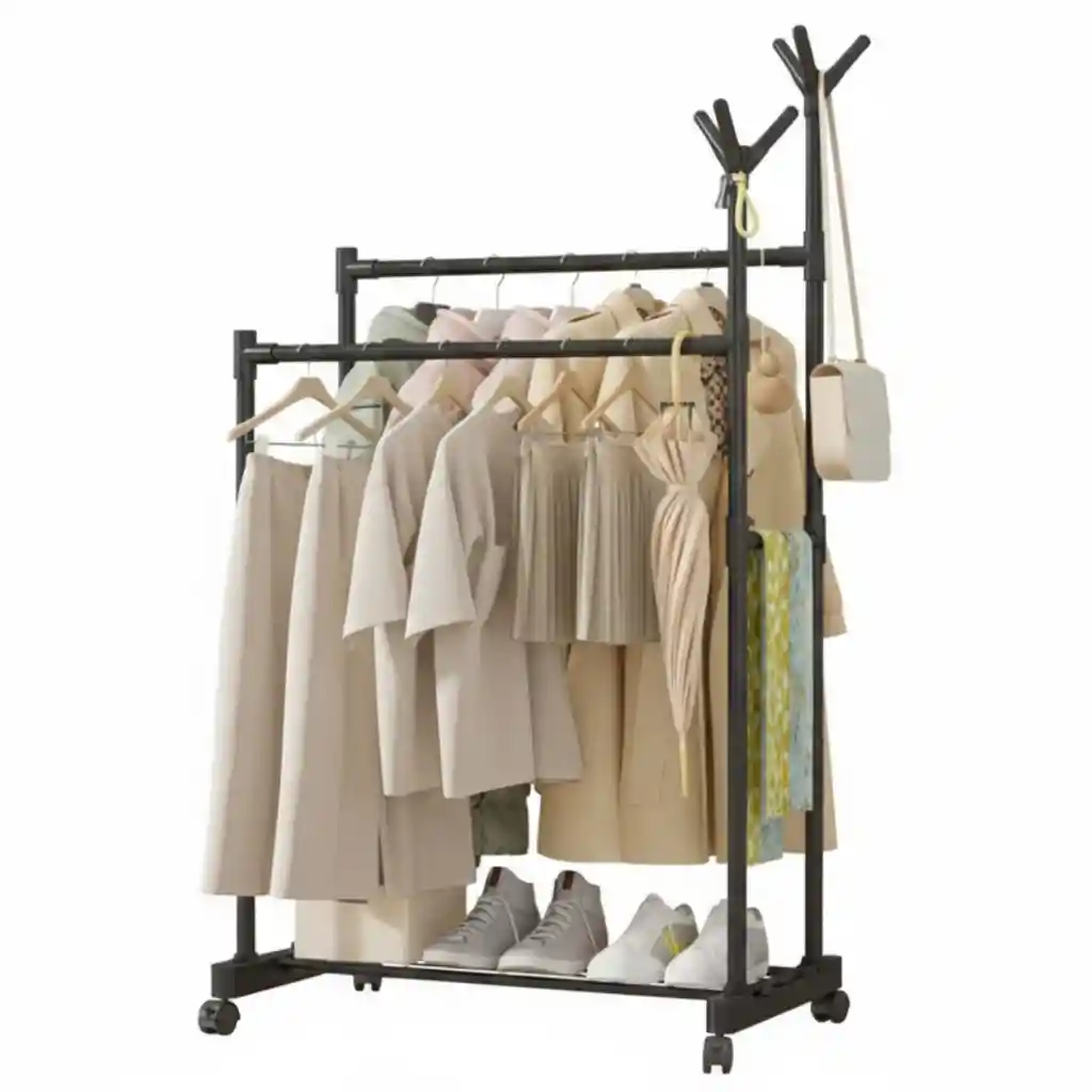 Perchero de Pie Doble – Organizador Versátil y Compacto El perchero de pie doble es una solución de almacenamiento versátil y compacta, diseñada con un estilo moderno y funcional en color negro mate. Es ideal para organizar ropa, calzado y accesorios en espacios reducidos, manteniendo todo visible, ordenado y de fácil acceso. Gracias a su estructura metálica robusta y su diseño móvil, se adapta perfectamente a dormitorios, recibidores, vestidores o zonas de lavandería. Especificaciones del Producto Tipo: Perchero de pie organizador Color: Negro mate Material: Estructura tubular metálica Estilo: Moderno / Industrial Tipo de instalación: Independiente Movilidad: Con ruedas giratorias Uso recomendado: Ropa, calzado, bolsos y accesorios Dimensiones Alto: 133 cm Ancho (frente): 76 cm Profundidad: 41 cm Características Principales Doble barra de colgado: Dos niveles de barras paralelas a diferentes alturas que permiten colgar camisas, pantalones, chaquetas y abrigos sin amontonarlos, aprovechando mejor el espacio vertical. Poste lateral multiusos: Incluye un poste extendido con ganchos integrados tipo árbol, ideales para colgar bolsos, sombreros, bufandas, mochilas o paraguas. Estante inferior para calzado: Base de rejilla resistente, diseñada para organizar zapatos, cajas o accesorios, manteniéndolos separados del suelo. Movilidad total: Equipado con cuatro ruedas giratorias, facilita mover el perchero de un espacio a otro incluso cuando está completamente cargado. Diseño robusto y estable: La estructura metálica tubular proporciona firmeza y durabilidad, con un acabado negro mate que combina con decoraciones minimalistas, modernas o nórdicas. Contenido del Paquete Cantidad: 1 perchero de pie doble Estructura metálica desmontable Barras de colgado Estante inferior Ruedas giratorias Accesorios de montaje Garantía y Derecho de Retracto Garantía: 30 días por defectos de fabricación. Derecho de retracto: Según normativa vigente. Nota Importante Para aplicar garantía o retracto se deben enviar fotos y/o videos que evidencien claramente el estado del producto. La garantía no cubre daños por golpes, humedad, mal uso o manipulación indebida.