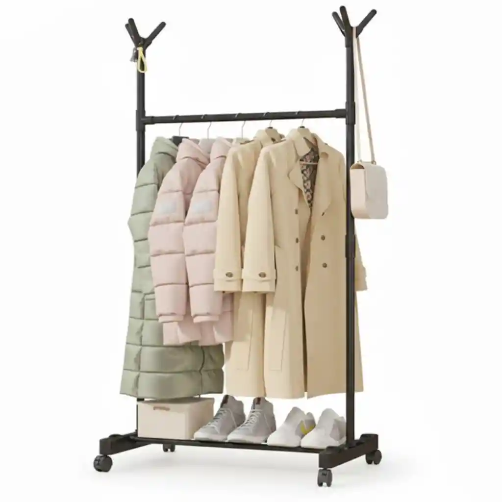 Perchero Multifuncional de Pie – Organizador Minimalista El perchero multifuncional de pie es una solución práctica y elegante para organizar ropa, calzado y accesorios en espacios reducidos como dormitorios, recibidores o vestidores. Su diseño minimalista en color negro mate aporta orden, funcionalidad y estilo moderno a cualquier ambiente. Especificaciones del Producto Tipo: Perchero organizador de pie Color: Negro mate Material: Estructura metálica Estilo: Minimalista / Moderno Tipo de instalación: Independiente Movilidad: Con ruedas giratorias Uso recomendado: Ropa, calzado, bolsos y accesorios Dimensiones Altura total: 152 cm Ancho (largo): 76 cm Profundidad: 41 cm Características Principales Barra principal: Barra horizontal resistente para colgar perchas con abrigos, chaquetas, vestidos o camisas. Ganchos laterales tipo “Y”: Ubicados en la parte superior de ambos postes, ideales para colgar bolsos, sombreros, bufandas o paraguas. Estante inferior: Base tipo repisa para organizar zapatos, cajas de almacenamiento o cestas. Movilidad total: Equipado con 4 ruedas giratorias que permiten mover el perchero fácilmente de una habitación a otra, incluso cuando está cargado. Diseño robusto y duradero: Fabricado en estructura metálica con acabado negro mate, que aporta estabilidad, resistencia y una apariencia moderna. Beneficios del Producto Ahorro de espacio: Su diseño vertical maximiza el almacenamiento sin ocupar mucha superficie en el suelo. Versatilidad: Diseño abierto que mantiene las prendas visibles, ventiladas y siempre a la mano. Portabilidad: Puede desplazarse cómodamente gracias a sus ruedas, facilitando la limpieza y reorganización del espacio. Contenido del Paquete Cantidad: 1 perchero multifuncional de pie Estructura metálica desmontable Barra de colgado Estante inferior 4 ruedas giratorias Accesorios de montaje Garantía y Derecho de Retracto Garantía: 30 días por defectos de fabricación. Política de retracto: Aplica dentro de los 5 días hábiles posteriores a la entrega. El producto debe devolverse sin uso, en perfecto estado y con su empaque original intacto. Nota Importante Para aplicar garantía o retracto se deben enviar fotos y/o videos que evidencien claramente el estado del producto.