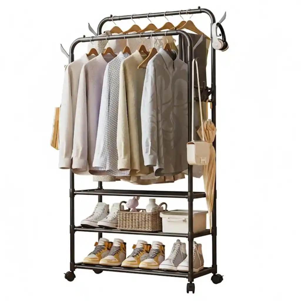 Perchero Doble con Zapatero – Organizador Multifuncional Descripción del Producto Perchero de ropa doble con diseño moderno y funcional, ideal para optimizar espacios reducidos como dormitorios, vestidores, entradas o lavanderías. Su estructura metálica en color negro mate combina resistencia, estabilidad y estilo industrial, ofreciendo una solución completa para organizar prendas, calzado y accesorios en un solo mueble. Cuenta con doble barra de colgado a diferentes alturas, tres estantes inferiores tipo rejilla para zapatos y ganchos laterales tipo “rama” para bolsos, sombreros, paraguas u otros accesorios. Incluye ruedas giratorias que facilitan su desplazamiento incluso cuando está completamente cargado. Especificaciones Doble Barra de Colgado: Barra trasera 162 cm, barra frontal 145 cm; permite organizar ropa larga y corta sin que se amontone. Estantes Inferiores: 3 niveles tipo rejilla para organizar zapatos, cajas o cestas. Ganchos Laterales: Para bolsos, sombreros, bufandas o accesorios. Movilidad: Ruedas giratorias para fácil desplazamiento. Material: Estructura metálica tubular. Color: Negro mate, estilo industrial/moderno. Uso Ideal: Dormitorios sin armario empotrado, vestidores, entradas de casa o lavanderías. Beneficios del Producto Aprovecha el espacio vertical de forma eficiente. Permite organizar ropa larga y corta sin que se amontone. Mantiene el calzado ventilado y visible. Fácil de mover y reubicar gracias a sus ruedas. Aporta orden y estética a cualquier habitación. Dimensiones Altura barra trasera: 162 cm Altura barra frontal: 145 cm Ancho total: 60 cm Contenido del Paquete 1 Perchero doble con zapatero Ruedas giratorias Kit de instalación Manual de armado Garantía Este producto cuenta con 30 días de garantía por defectos de fabricación. Política de Retracto Aplica derecho de retracto dentro de los 5 días hábiles posteriores a la entrega. El producto debe devolverse sin uso, en perfecto estado y con su empaque original intacto. Nota Importante Para aplicar garantía o retracto se deben enviar fotos y/o videos que evidencien claramente el estado del producto. La garantía no cubre daños por golpes, humedad, mal uso o manipulación indebida.