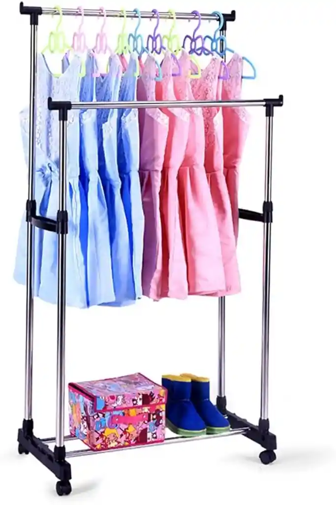Presentamos nuestro perchero doble con estante metálico, un práctico exhibidor de ropa diseñado para satisfacer tus necesidades de organización y almacenamiento. Con una capacidad de hasta 30 kg, este perchero es ideal para mantener tu ropa ordenada y accesible en cualquier espacio. Este genial perchero para tu ropa es ideal para ti, ya que no ocupa mucho espacio y hace ver tu espacio mucho mas organizado. Tiene un diseño hermoso y tiene ruedas por lo que se puede mover a cualquier lado muy fácil. -Material: Fabricado en acero inoxidable 201 plateado con accesorios de plástico negro. -Dimensiones: Largo 85 cm x Ancho 43 cm x Altura ajustable de 95 cm a 160 cm. -Espesor del tubo: 25,4 x 0,4 mm. -Equipado con ruedas universales en la parte inferior para facilitar su movimiento. -Diseñado para ser retráctil hacia arriba y hacia abajo, lo que lo hace adaptable a diferentes espacios y necesidades.