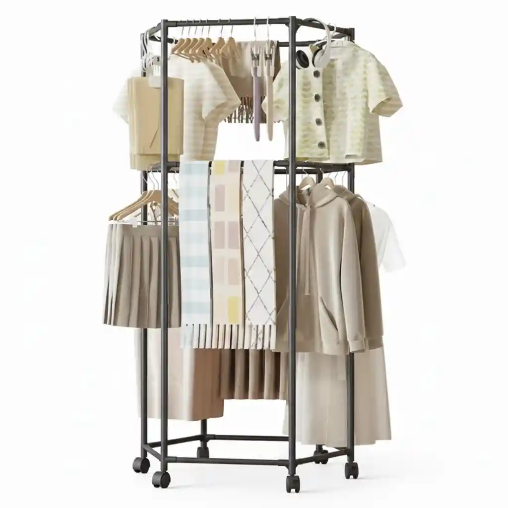 Perchero Hexagonal Doble – Organizador Modular de Dos Niveles Descripción del Producto Perchero modular de dos niveles, diseñado para maximizar el almacenamiento en espacios reducidos sin sacrificar estabilidad ni estilo. Su estructura metálica en color negro mate presenta una base hexagonal, que proporciona excelente equilibrio y soporte, permitiendo organizar gran cantidad de prendas en un área mínima. Gracias a su diseño abierto y vertical, mantiene la ropa siempre visible, ventilada y de fácil acceso. Incluye ruedas giratorias que permiten desplazarlo cómodamente incluso cuando está completamente cargado. Especificaciones Estructura de Dos Niveles: Permite colgar ropa corta en la parte superior y prendas más largas o accesorios en el nivel medio. Diseño Modular y Abierto: Facilita la organización, ventilación de las prendas y acceso rápido. Base Hexagonal Estable: Ocupa poco espacio en el suelo y ofrece mayor firmeza. Movilidad: Equipado con ruedas giratorias, algunas con sistema de bloqueo. Material: Metal de alta resistencia. Color: Negro mate. Uso Ideal: Dormitorios, vestidores, apartamentos, tiendas, entradas o habitaciones con espacio limitado. Beneficios del Producto Aprovecha al máximo el espacio vertical. Permite organizar ropa larga y corta de forma separada. Mantiene las prendas ventiladas, visibles y ordenadas. Se puede mover fácilmente incluso estando cargado. Aporta un diseño moderno y elegante a cualquier ambiente. Dimensiones Altura total: 175 cm Ancho superior: 70 cm Ancho de la base (cara frontal): 36 cm Contenido del Paquete 1 Perchero hexagonal doble Ruedas giratorias Kit de instalación Manual de armado Garantía Este producto cuenta con 30 días de garantía por defectos de fabricación. Política de Retracto Aplica derecho de retracto dentro de los 5 días hábiles posteriores a la entrega. El producto debe devolverse sin uso, en perfecto estado y con su empaque original intacto. Nota Importante Para aplicar garantía o retracto se deben enviar fotos y/o videos que evidencien claramente el estado del producto. La garantía no cubre daños por golpes, humedad, mal uso o manipulación indebida.