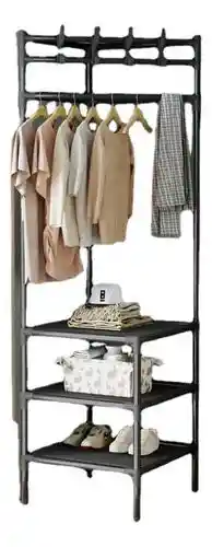 Perchero Esquinero Estante Organizador Para Ropa Color Negro - Ideal para ubicarlo en una esquina de tu casa - Cuenta con 3 niveles inferiores, 1 tubo para colgar ganchos de ropa y 4 percheros superiores. - Los tubos son de metal con procesos de pulverización electrostática y los conectores son plásticos PP. - Los niveles inferiores son en tela no tejida. - Su montaje es realmente fácil, no requiere herramientas, todo encaja fácilmente. - Mantener todo en su lugar será sencillo, ahorrando espacio y manteniendo el orden.