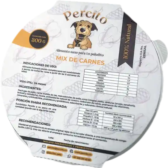 Alimento húmedo cocido natural con proteína alta calidad (Pollo y Res), vitaminas, minerales, prebióticos, probióticos y antioxidantes naturales. Formulado para cubrir los requerimientos nutricionales para perros adultos y cachorros desde las 8 semanas de edad.