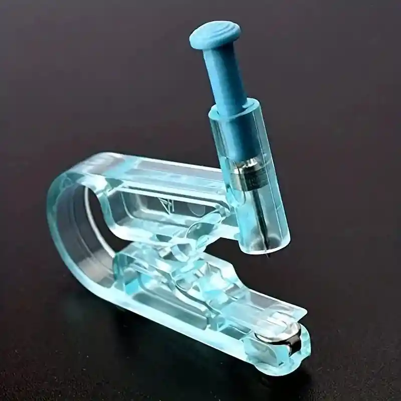 perforador de orejas , incluye 4 topitos en acero con mariposa plastica.