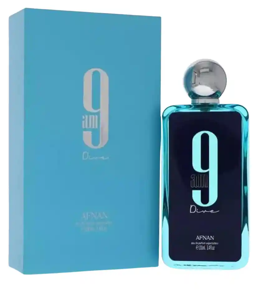 9am Dive de Afnan es una fragancia de la familia olfativa Aromática Acuática para Hombres y Mujeres. 9am Dive se lanzó en 2022. La Nariz detrás de esta fragrancia es Imran Fazlani. Las Notas de Salida son limón (lima ácida), menta, grosellas negras y pimienta rosa; las Notas de Corazón son manzana, cedro y incienso; las Notas de Fondo son jengibre, sándalo, pachulí y jazmín.