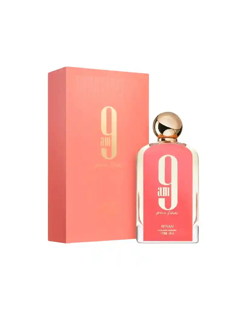 9am pour Femme de Afnan es una fragancia de la familia olfativa Oriental para Mujeres. 9am pour Femme se lanzó en 2022. Las Notas de Salida son toronja (pomelo), bergamota y mandarina; las Notas de Corazón son frambuesa y grosellas negras; las Notas de Fondo son almizcle, ámbar y naranja.