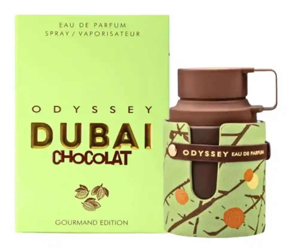 MARCA: ARMAF GENERO: HOMBRE FAMILIA: CALIDO, CAFE, DULCE AMADERADO, NUECES, AMBAR, CHOCOLATE TAMAÑO: 100 ML DESCRIPCION: Odyssey Dubai Chocolat de Armaf es una fragancia de la familia olfativa Oriental Vainilla para Hombres y Mujeres. Esta fragrancia es nueva. Odyssey Dubai Chocolat se lanzó en 2025. Las Notas de Salida son café, pistacho (pistache), Knafeh, praliné y avellana; las Notas de Corazón son chocolate, cardamomo y vainilla; las Notas de Fondo son Amberwood, haba tonka y caramelo.