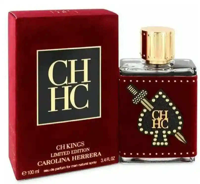 El perfume de la imagen se llama CH Kings de Carolina Herrera, una fragancia masculina de edición limitada lanzada en 2019, que celebra el carisma, la valentía y el espíritu juguetón del hombre moderno; su composición comienza con notas frescas y especiadas de pimienta rosa y cardamomo, se enriquece con un corazón de salvia y cacao, y se apoya en una base cálida y sensual de haba tonka, madera de cedro y pachulí, todo envuelto en un frasco decorado con cuero rojo y un as de espadas dorado, que evoca poder, elegancia y estilo rebelde.