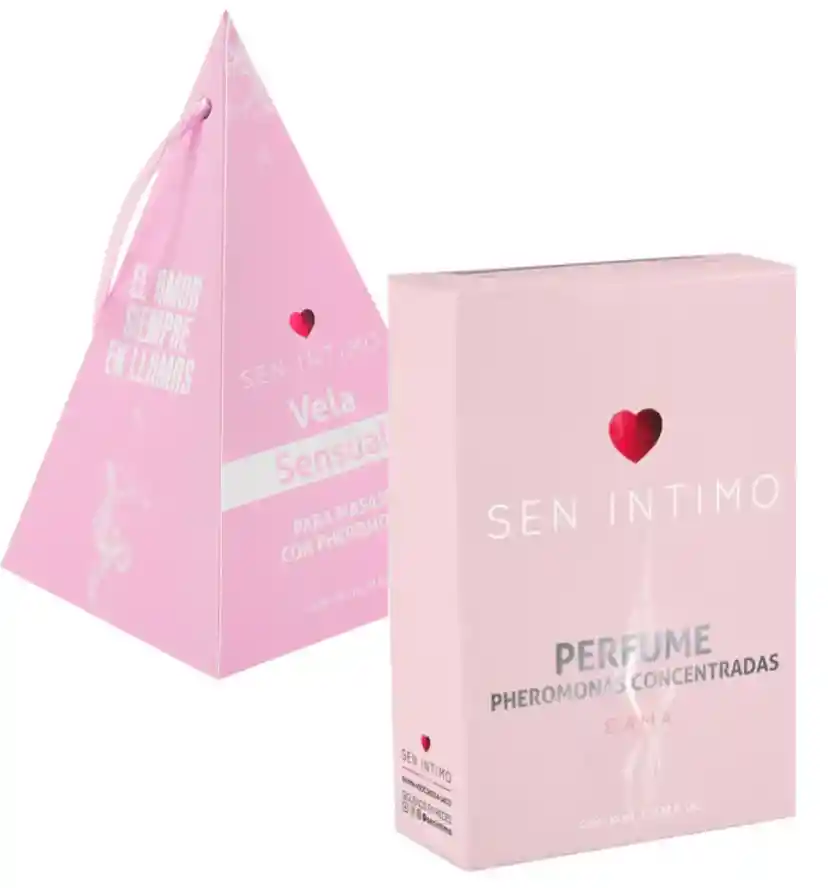 -Sen Intimo Perfume Feromonas Pheromonas Concentradas Para Dama: ¡Conquista al que quieras! totalmente sin olor y concentradas, perfectas para combinarlas con tu loción preferida. Aplica 10 gotas de feromonas concentradas en tu loción favorita y vuélvete totalmente irresistible para el sexo opuesto. Las feromonas son sustancias químicas naturales segregadas por el cuerpo a través de la transpiración (sudor), cuyo olor se desprende encargándose de atraer al que deseemos. Este producto sin olor se acciona por el calor de tu propio cuerpo, incrementando la secreción normal de feromonas, haciéndote más irresistible. Características: • Incrementa y sensibiliza los sentidos • sofisticado y práctico envase para llevar siempre contigo • estimula el deseo sexual de forma natural a través del aroma • Definitivamente te sentirás más atractiva • Cantidad: 10ml. -Vela Erotica Para Masajes Con Feromonas Sen Intimo 25ml: Enciende la pasión con un sensual masaje y el delicioso aroma de esta exquisita vela, que al encenderse se convierte en un sedoso aceite para masajes, combinando aceites naturales y vitaminas con un sutil toque de pheromonas, que incitarán a la pasión y el deseo. Vela que se convierte en aceite para masajes cuando se funde: No requiere Jabón, humecta y suaviza la piel, NO mancha. Fragancia Fresa Salvaje. Esta vela está creada con delicadas feromonas que llenarán el ambiente de sensuales aromas que invitan a la fantasía. Convierte un ambiente tradicional en un momento inolvidable, con estas velas aromáticas. Perfectas para un encuentro con tu pareja. Cantidad: 25ml.