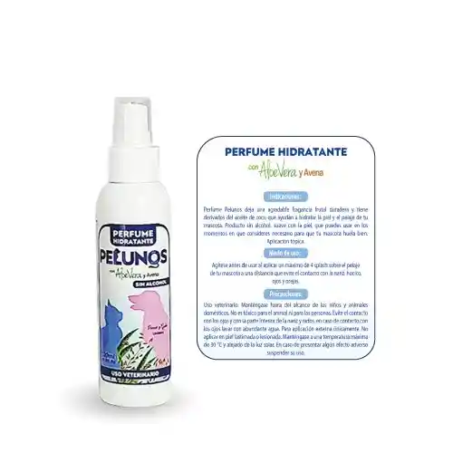 Cuida la piel y pelaje de cada peludito, aportando Hidratación con un agradable fragancia sin alcohol etílico, no reseca la piel y ser más amigables con la misma. Acción duradera Contiene: Aloe Vera y Avena Uso: Perro y Gatos TAMAÑO: 120 mL