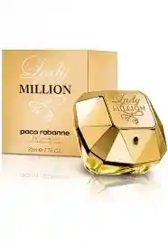 Lady Million de Paco Rabanne (Eau de Parfum, 80 ml) es una fragancia femenina lanzada en 2010, conocida por su envase dorado en forma de diamante y su aroma floral‑frutal con un toque gourmand: despierta con notas de frambuesa, neroli, limón de Amalfi y naranja amarga evoluciona hacia un corazón elegante de jazmín, flor de azahar y gardenia y se posa sobre un fondo cálido y adictivo de miel blanca, pachulí y ámbar uy elogiada por su carácter sofisticado y femenino, Lady Million se ha convertido en un clásico moderno y un favorito que recibe constantes halagos en sus reseñas