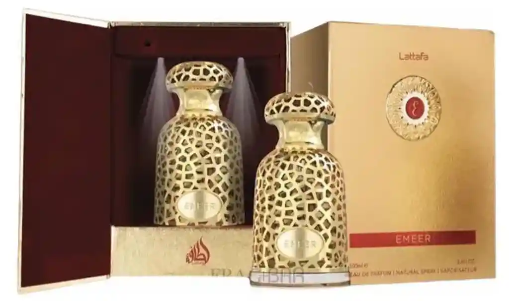 Es un Eau de Parfum (EDP) de 100 ml, presentado en un frasco dorado con diseño árabe calado y una caja de lujo en tono dorado con detalles rojos. Esta fragancia unisex se caracteriza por su estilo oriental‑amaderado, ideal para climas fríos o uso nocturno.