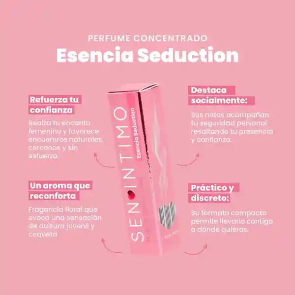 Esencia Seduction - Perfume Concentrado Roll-On (10ml) ¡Resalta tu encanto y deja huella! La Esencia Seduction de Sen Intimo es un perfume concentrado diseñado para la mujer que desea proyectar seguridad y feminidad en cada paso. Su formato práctico te permite llevar contigo un aroma cautivador que se adapta perfectamente a tu ritmo de vida. Beneficios Principales Confianza Irresistible: Realza tu encanto femenino, favoreciendo encuentros naturales, cercanos y sin esfuerzo. Aroma que Reconforta: Disfruta de una fragancia floral que evoca una sensación de dulzura juvenil y coqueta. Destaca Socialmente: Sus notas están diseñadas para acompañar tu seguridad personal, resaltando tu presencia en cualquier entorno. Diseño Práctico y Discreto: Gracias a su formato compacto, es el aliado perfecto para llevar en el bolso y reaplicar cuando lo necesites. Detalles del Producto Tipo: Perfume Concentrado. Fragancia: Notas florales con toque dulce. Presentación: Envase portátil ideal para el uso diario. Marca: Sen Intimo. Ideal para: Esas ocasiones donde quieres sentirte segura, femenina y con un aroma fresco que dure todo el día.