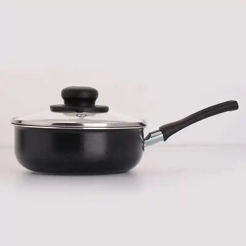 Perol Aliada + Tapa De Vidrio 18 cm Completa tu cocina con nuestro perol antiadherente y prepara tus recetas favoritas. • Cuerpo en aluminio con antiadherente de espesor 1 mm. • Ideal para preparar comidas saludables y bajas en grasa. • Fondo grafilado para mayor estabilidad al cocinar y mejor distribución de calor en la base. • Mango en baquelita resistente al calor. Tamaño • 16 cm de ancho Materiales del producto • Aluminio: 70%. • Baquelita: 30%. Recomendaciones • Solo para uso doméstico. • No calientes sin alimento en el interior. • La llama no se debe extender hasta las paredes del producto. • No introduzcas en hornos convencionales ni microondas. • Siempre usa protección para retirar el producto después de usarlo. • No uses utensilios metálicos ya que pueden deteriorar el antiadherente. • No almacenes alimentos en el producto ya que puede generar manchas y cambios de color. • No cortes alimentos dentro del producto.