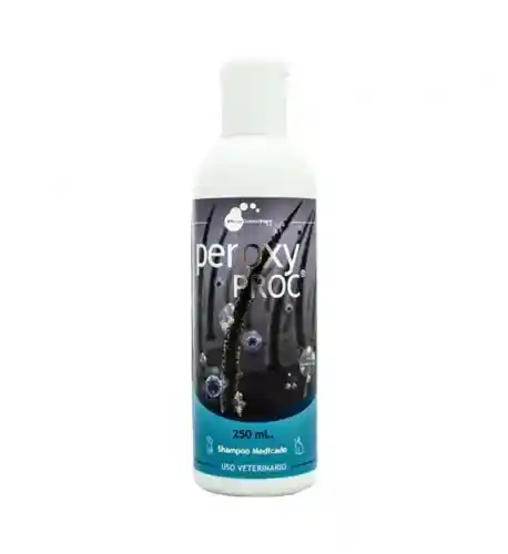 Shampoo peroxy proc es un shampoo medicado con peróxido de benzoilo al 2.5%. por vía tópica al entrar en contacto con la piel, el peróxido de benzoilo interactúa con sustancias biológicas cutáneas, liberándose radicales libres de oxigeno que rompen la membrana celular de la bacteria. indicaciones: para uso en perros y gatos. por su acción queratolitica produce leve descamación cutánea y reduce la cantidad de ácidos graso en la piel. tiene propiedades antimicrobianas, antiinflamatorias y sebostáticas.