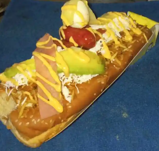 Salchicha Zenu Americana, Pan Bimbo, Cebolla,Papas rippio, Queso rallado, Jamon, Queso doble Crema, Tocineta, Huevo de codorniz, Aguacate