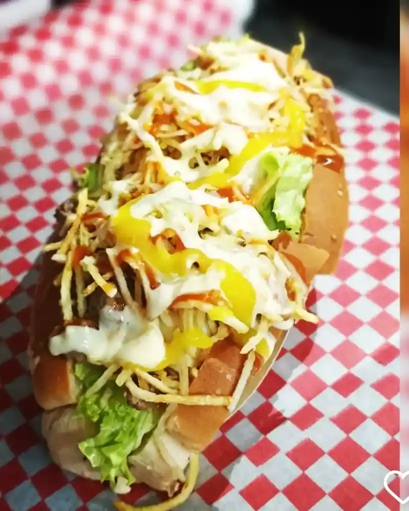 pan, salchicha,ripio ,cebolla al gusto,queso rralado y salsas (opcional ensalada de zanahoria y repollo )