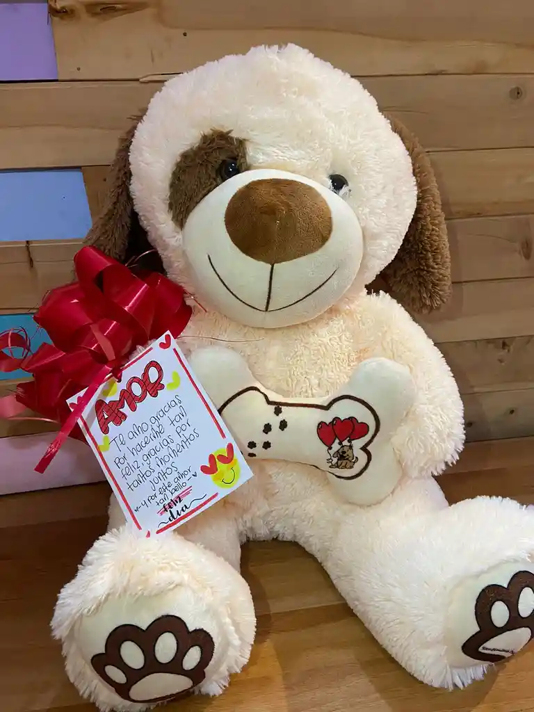 Hermoso perro hueso de peluche con una medida de 70 centimetro de longitud completa aproximada. Tiene un hermoso pelaje extra suave Nuestros peluches son fabricados con materiales de primera calidad, relleno de algodón siliconado antialergico suave que no se deforma ni endurece con el tiempo y brinda sensación de suavidad al tacto.
