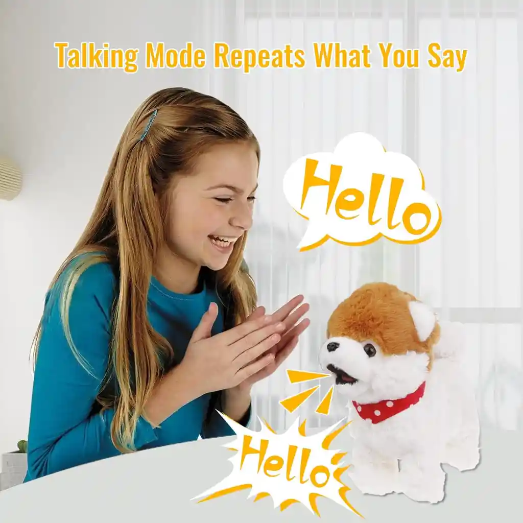 Mascota inteligente y divertida juega como un perrito de verdad, saca la lengua, tiene collar, el perrito tienen sonidos, es tierno y cariñoso responde cuando tocas su cabeza es obediente y se sienta, responde cuando aplaudes, hace diferentes trucos, movimientos como estirarse, sentarse, etc. Elige el diseño al lado del botón comprar. Requiere 4 pilas AAA (No Incluidas) Medidas: 23cm x 17 cm Envíos a nivel nacional, ventas al por mayor y al detal.