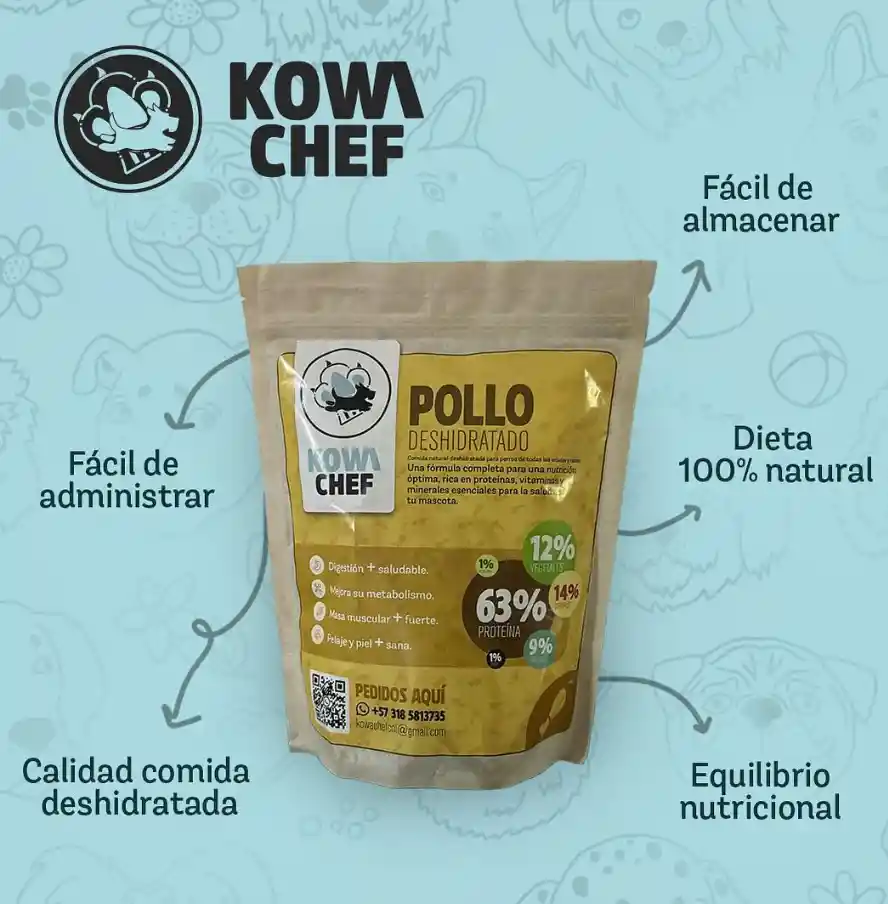Kowa Chef ofrece comida BARF deshidratada 100% con proteína de pollo, vitaminas y minerales esenciales para una vida más sana, fuerte y llena de energía. Mejora el pelaje, el metabolizmo y aliento de tu peludo.