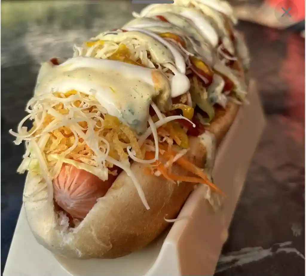 pan, salchicha,ripio ,tocineta,jamon,huevo, cebolla al gusto,queso rralado y salsas(opcional ensalada de zanahoria y repollo )