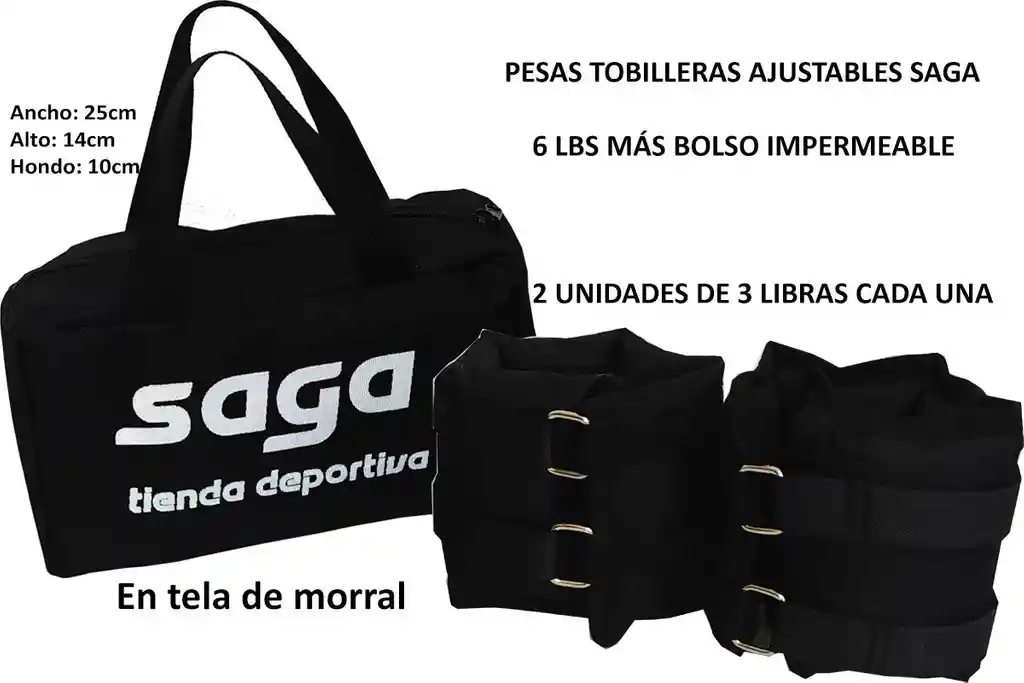 PESAS TOBILLERAS AJUSTABLES SAGA 6 LBS MÁS BOLSO IMPERMEABLE 2 UNIDADES DE 3 LIBRAS CADA UNA (3 KILOS REALES EN TOTAL). SOMOS FABRICANTES. TE GARANTIZAMOS EL MEJOR PRECIO Y UNA EXCELENTE CALIDAD. Disponible de color negro. El kit incluye un bolso con agarraderas. Fabricadas por expertos confeccionistas con insumos nacionales de la mejor calidad. En tela de morral, muy fácil de lavar. El peso es graduable. Con doble correa para mejor ajuste. Correas ajustables a tobillos, muñecas y cintura de máximo 100 cm (juntando las dos tobilleras) El peso se logra con bolsas de arena de granulometría media, empacadas en doble bolsas herméticas. Tenemos una versión del mismo tamaño siendo el doble de pesada. ( ver nuestras otras publicaciones) Se llama Pesas Tobilleras Ajustables 12 libras Hierro impermeables. . Mantenerlo en un lugar fresco y seco. 2. Eventualmente retire las unidades individuales de peso y séquelas al aire libre. 3. Lave a mano las tobilleras. 4. Úselas preferiblemente con medias con el fin de evitar que el sudor produzca mal olor.