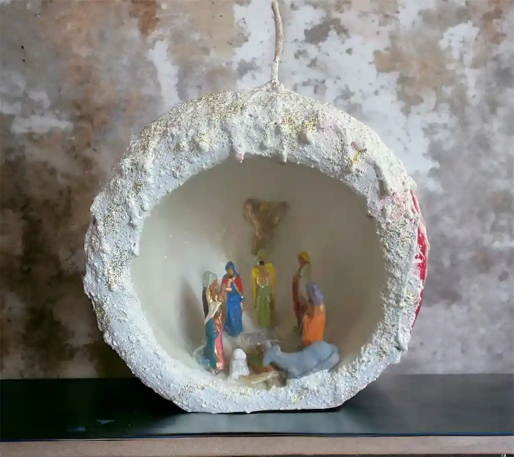 Pesebre decorativo en velar color rojo más luces con las siguientes dimensiones: 12.5 cm x 12.5 cm aproxidamente.