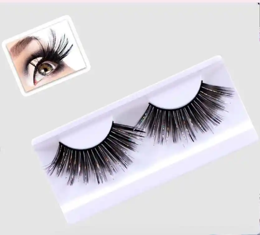 Pestañas con reflejos plateados, ideales para brillar en eventos, disfraces o presentaciones.