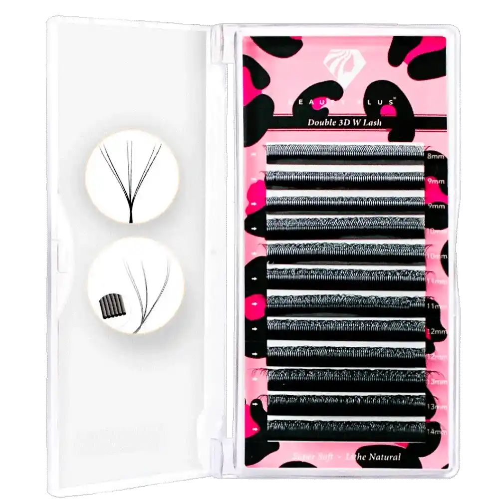 Su exclusiva forma en «W» con 3 extensiones de doble punta agrupadas en un abanico equivalente a 6 extensiones individuales y su base plana. Esto no solo garantiza un efecto único, denso y elegante, sino también un contacto perfecto con las pestañas naturales y el adhesivo, lo que prolonga significativamente la durabilidad de las extensiones en comparación con los abanicos regulares. Las pestañas Beauty Plus Double 3D-W Lash representan la combinación perfecta entre volumen, definición y comodidad, diseñadas específicamente para lashistas que desean ofrecer un servicio exclusivo y de alta calidad. Este modelo destaca por su diseño innovador de doble capa, que proporciona un efecto tridimensional pronunciado y un volumen impresionante, ideal para quienes buscan un look más dramático y sofisticado. Cada bandeja incluye pestañas en una variedad de longitudes, desde los 8 mm hasta los 14 mm, lo que permite una personalización completa para adaptarse a las necesidades y preferencias de cada cliente. Estas pestañas están fabricadas con materiales súper suaves y ligeros, garantizando comodidad incluso en aplicaciones prolongadas. Su textura fina y sedosa facilita su manejo, permitiendo una aplicación rápida y precisa, ideal tanto para lashistas principiantes como para técnicas experimentadas. El diseño Double 3D-W Lash no solo asegura un acabado de alta definición, sino que también está pensado para mantener su forma y volumen a lo largo del tiempo. Su estructura de múltiples capas crea un efecto de abanico perfectamente equilibrado, aportando profundidad y dimensión a la mirada. Además, su curvatura es uniforme y estable, lo que asegura un resultado impecable y profesional en cada aplicación. Estas pestañas son ideales para clientes que desean resaltar su mirada con un estilo llamativo y único, pero sin renunciar a la naturalidad y la comodidad. Con Beauty Plus Double 3D-W Lash, puedes elevar tu servicio al siguiente nivel, ofreciendo un producto de calidad premium que cumple con las expectativas de los clientes más exigentes. Curvatura :D Grosor: 0.07 Largo: 8-14 MIX