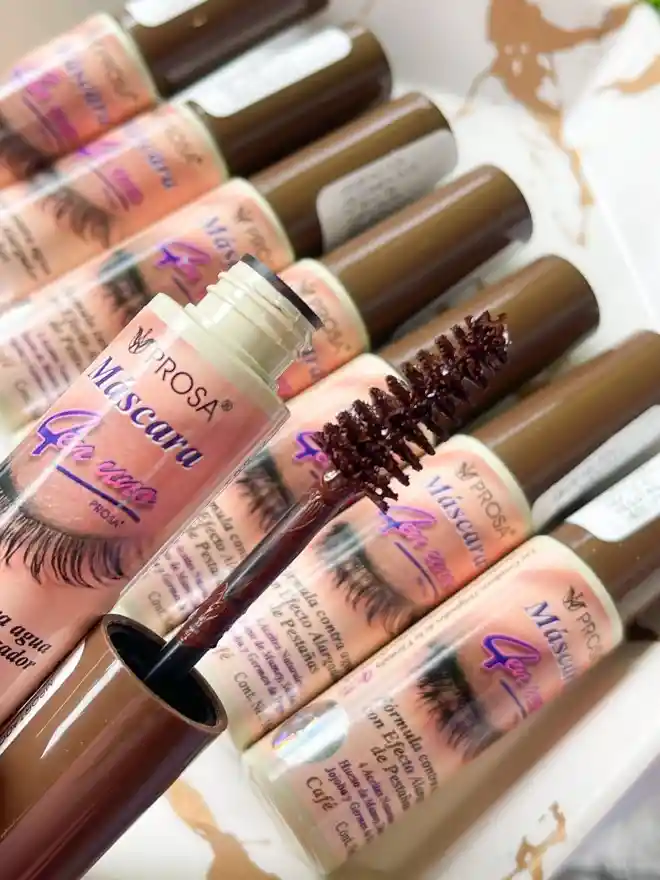 Pestañina a prueba de agua de la marca Prosa, color café, con cepillo especial que dejan las pestañas con un largo extremo, separadas y con mucho volumen.