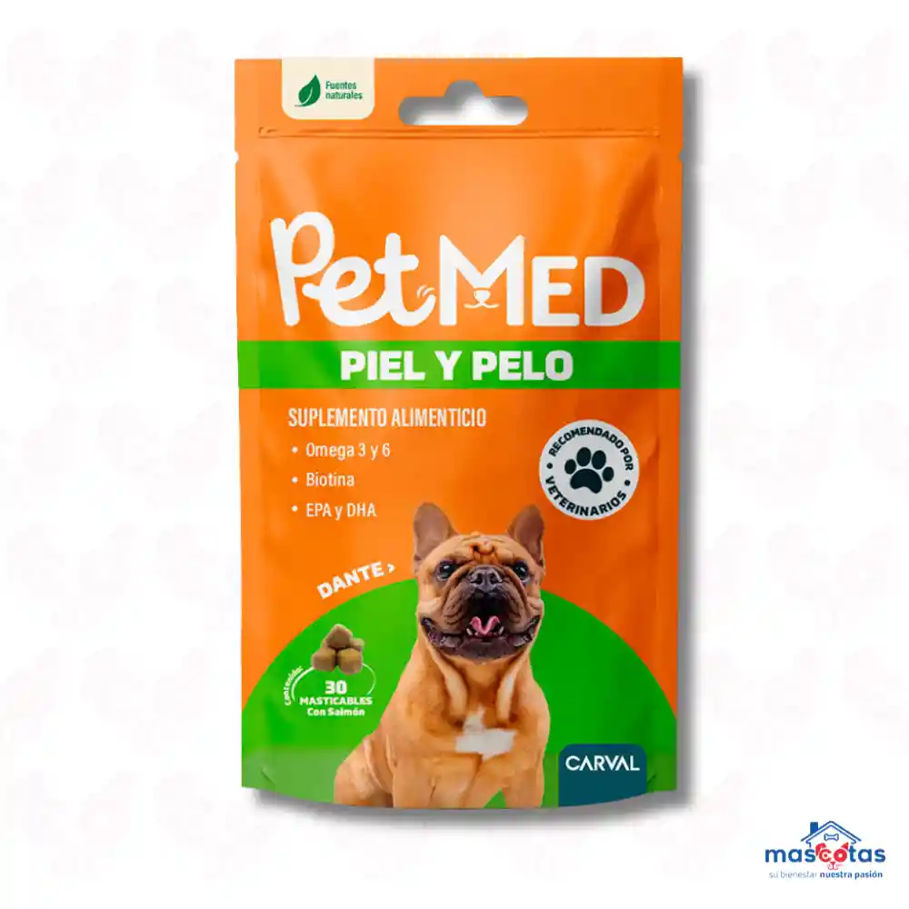 Los suplementos alimenticios Pet Med x30 masticables son snacks funcionales para perros, diseñados en gomas altamente palatables para mejorar la salud articular, digestiva, inmunológica o de piel y pelo. Contienen ingredientes naturales y activos para promover la calidad de vida en perros de todas las edades Pet Med Piel y Pelo (30 Masticables): Enriquecido con Omega 3 y 6, biotina, EPA y DHA. Fortalece el pelaje, reduce la caída y mantiene la piel hidratada.