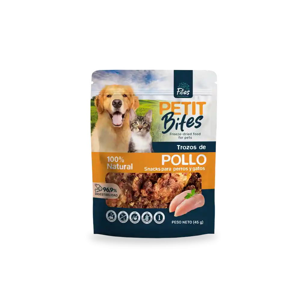 Producto liofilizado fabricado exclusivamente con muslos de pollo, proteína de alto valor biológico rica en aminoácidos esenciales. tiene una alta digestibilidad de la proteína . No contienen saborizantes, edulcorantes ni colorantes. Libres de salmonela, listeria monocytogenes y coliformes totales y fecales. Producto de un solo ingrediente. Sin gluten ni ingredientes adicionales.