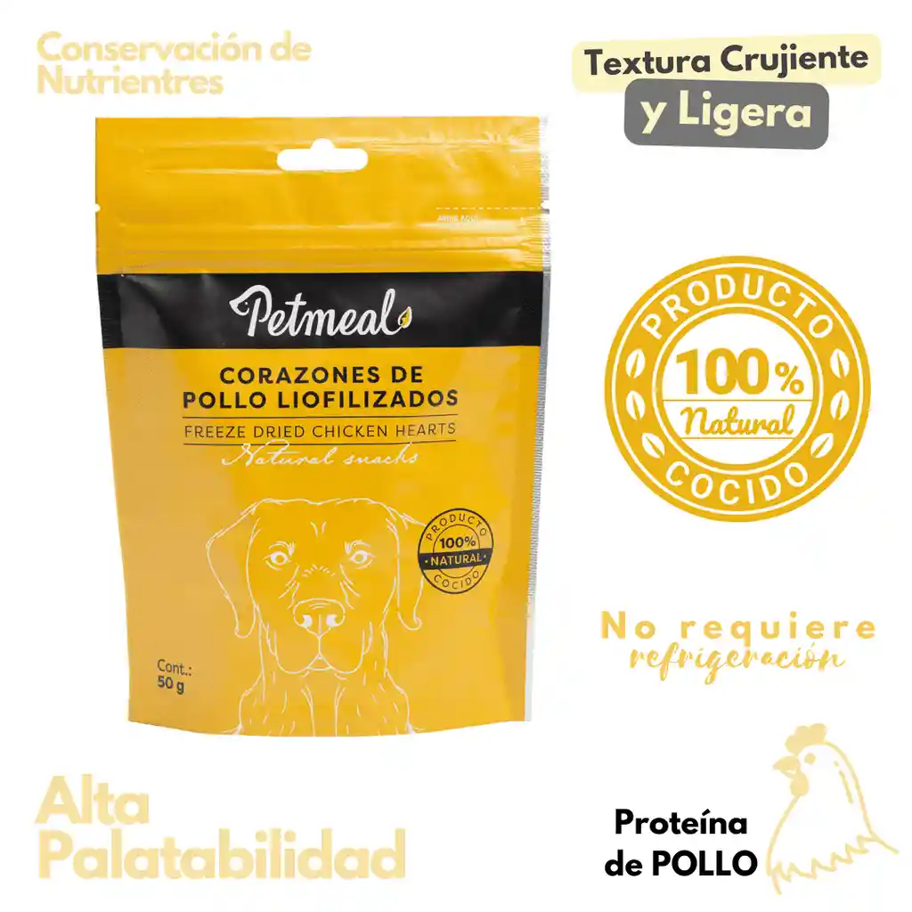 Corazones de pollo cuidadosamente cocidos y deshidratados. Del tamaño de un bocado, son ligeros y crocantes. Elaborados de un solo ingrediente. Veras la felicidad de tu mascota empacada en pequeños bocados.
