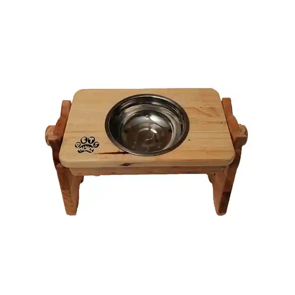 Comedero Para Gato Simple de Altura Graduable Ref.: Memin1P. Elaborado en Madera Pino Certificada. Tazas en Melamina. Mesa Color Natural y Base Color Miel. Altura 20 cm