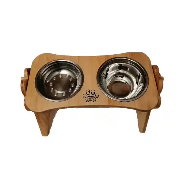 Comedero Para Perro Pequeño Altura Graduable Ref.: Huellasp. Elaborado en Madera Pino Certificada. Tazas en Acero. Mesa Color Caramelo y Base Color Natural. Altura 22 cm. Razas Referencia: Bulldog Francés. Pug. Shitzu. West. Schnauzer.