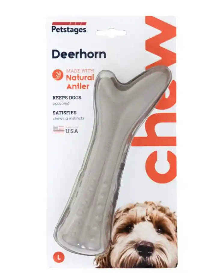 El mordedor Deerhorn de Petstages está fabricado en EE. UU. con una mezcla de material sintético y asta de ciervo natural, lo que le otorga un aroma y sabor irresistibles que mantienen a los perros ocupados por mucho tiempo. Diseñado para satisfacer los instintos naturales de masticación, este juguete de tamaño Large presenta diversas texturas que ayudan a limpiar los dientes y masajear las encías mientras el perro muerde. A diferencia de las astas reales, su composición está pensada para ser más segura para la dentadura, evitando astillamientos y ofreciendo una solución duradera y resistente para masticadores activos.