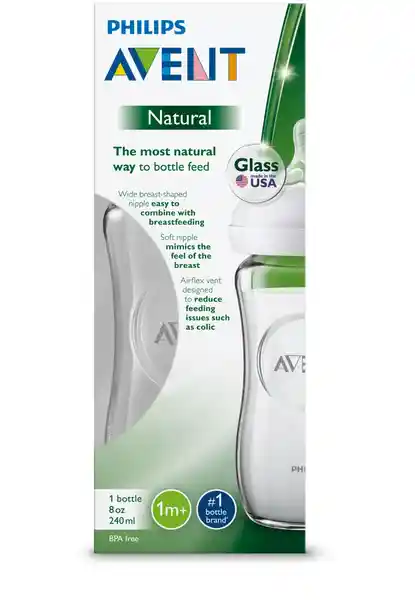 La Botella de Vidrio de 8 Onzas Naturales de Philips Avent es la Forma Más Natural de Alimentar Con Biberón. El Pezón Ancho en Forma de Seno en el Biberón Natural Promueve el Enganche Natural Para Que Pueda Combinar Fácilmente la Lactancia Materna y el Biberón. El Pezón Ultra Suave Imita la Sensación Del Seno. Nuestro Diseño Espiral Flexible Combinado Con Los Pétalos Confortables Permiten un Movimiento Natural Mientras se Alimenta al Bebé. Los Biberones Tienen Una Tecnología de Ventilación Air Flex Única Integrada en el Pezón y Están Diseñados Para Reducir Los Cólicos y Las Molestias al Ventilar el Aire Lejos de la Barriga de su Bebé. La Forma Ergonómica Hace Que Sea Cómodo Para Los Padres Sostenerlo y Que Los Dedos Pequeños Puedan Agarrarlo Fácilmente. El Montaje es Simple Con Solo Unas Pocas Piezas y el Cuello Ancho de la Botella Facilita el Llenado y la Limpieza. Esta Botella de Philips Avent Natural Está Hecha de Vidrio de Borosilicato de Primera Calidad un Material Libre de Bpa. Es Resistente al Calor y al Choque Térmico Por lo Que Puede Almacenarse de Forma Segura en el Refrigerador Calentarse y es Fácil de Lavar y Esterilizar. Funciona Con Todos Los Pezones y Tapas de la Línea Natural