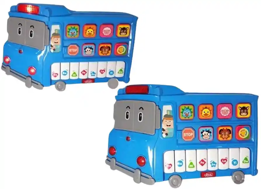 Somos: Inversiones MAZUGI PIANO PARA NIÑOS FORMA DE BUS Hecho de plástico Necesita 3 pilas AA (No vienen incluidas) Hace sonidos de animales y las notas musicales Tiene luces Medidas Alto: 18cm Largo: 28,2cm Ancho: 4cm Presentación en caja