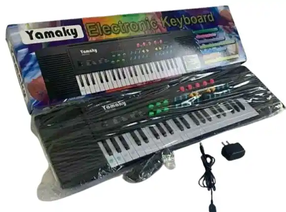 Microfono Funciona conectado o con pilas Ccuno de los parlantes es decorativo 8 SONIDOS DE INSTRUMENTOS, PIANO, ORGANO, VIOLIN, GUITARRA, MANDOLIN, BELL MISIC, TROMPETA 5 ACOMPAÑAMIENTOS DE PERCUSION: tambora, platillos, tambor, drums, samba timbal. 44 TECLAS NUMERADAS, MELODIAS INCORPORADAS, SISTEMA DE GRABACION., VOLUMEN DIGITAL GRADUAL, FUNCIONA CON CORRIENTE O PILAS AA (ADAPTADOR A CORRIENTE INCUIDO Y MICRIFONO), 65cm largo por 18 ancho