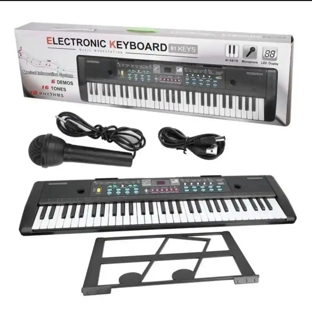 Piano Órganeta Electrónico de 61 Teclas Descubre la forma más divertida y completa de aprender música con este piano electrónico multifuncional, ideal para niños, jóvenes y principiantes. Características principales: 61 teclas con sonido realista tipo piano. 16 tonos y 10 ritmos para acompañar tus melodías. 8 sonidos de percusión para darle más ritmo. 6 canciones demo integradas para practicar. Entrada para micrófono incluida. Función de grabación y reproducción. Control de volumen y tempo ajustable. Pantalla digital y modo 2-Learn para facilitar el aprendizaje. Funciones extra: Chord, Fill-in, Sound Effect, Program, Music Stand. Funciona conectado directamente a la corriente o con pilas AA (no incluidas), para que lo uses en cualquier lugar. Medidas: 76 cm de largo x 20 cm de ancho x 7 cm de alto. Perfecto para practicar en casa, desarrollar habilidades musicales o regalar a pequeños talentos. ¡Aprende, crea y disfruta de la música con tu propio piano electrónico!