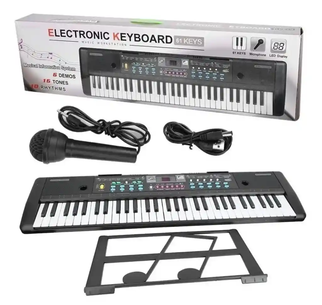 Piano Órganeta Electrónico de 61 Teclas Descubre la forma más divertida y completa de aprender música con este piano electrónico multifuncional, ideal para niños, jóvenes y principiantes. Características principales: 61 teclas con sonido realista tipo piano. 16 tonos y 10 ritmos para acompañar tus melodías. 8 sonidos de percusión para darle más ritmo. 6 canciones demo integradas para practicar. Entrada para micrófono incluida. Función de grabación y reproducción. Control de volumen y tempo ajustable. Pantalla digital y modo 2-Learn para facilitar el aprendizaje. Funciones extra: Chord, Fill-in, Sound Effect, Program, Music Stand. Funciona conectado directamente a la corriente o con pilas AA (no incluidas), para que lo uses en cualquier lugar. Medidas: 76 cm de largo x 20 cm de ancho x 7 cm de alto. Perfecto para practicar en casa, desarrollar habilidades musicales o regalar a pequeños talentos. ¡Aprende, crea y disfruta de la música con tu propio piano electrónico!
