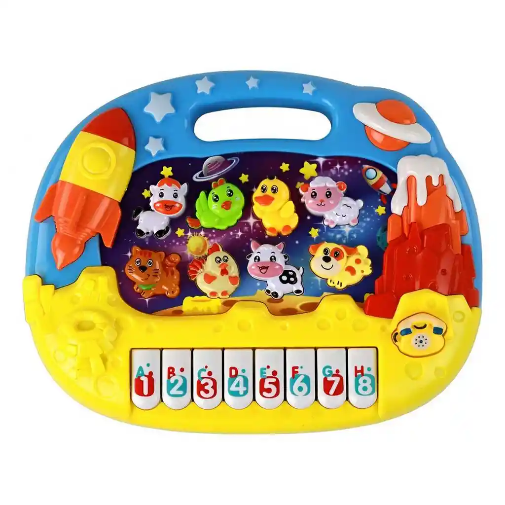 ¡Embárcate en un viaje musical a través del espacio con la tripulación más adorable de la galaxia! Este vibrante piano musical de animales es un universo de aprendizaje interactivo y diversión, donde tu pequeño astronauta puede componer sus primeras melodías en el teclado de 8 notas y descubrir los sonidos de una vaquita, una oveja, un pollito y muchos otros amigos granjeros en una aventura cósmica. Cada tecla y botón se ilumina con luces de colores al ritmo de la música, creando un espectáculo audiovisual que estimula los sentidos y ayuda a desarrollar la coordinación, el ritmo y el amor por la música desde una edad temprana. Con su práctico diseño y asa de transporte, es el juguete perfecto para llevar la exploración sonora y la creatividad a cualquier lugar, convirtiéndose en el regalo ideal para lanzar la imaginación de tu hijo hasta las estrellas. /// El juguete incluye baterias /// Ficha Técnica: Dimensiones : 26 cm x 20 cm x 5 cm Funcionamiento: 3 Baterías AA Material: Plástico ABS Edad Apta : + 3 años Certificado de conformidad: SL-CS-210044 Referencia: CY-8019C ** _Para defectos de fábrica o retractos: \_Por favor revise el producto apenas lo reciba y antes de usarlo. No aplican ley de retracto o defectos de fábrica luego de usar el producto. Se manejan máximo 5 días para reportar defectos de fábrica (por ejemplo, producto funciona mal, piezas faltantes, rotas, etc). Para hacer efectiva la devolución el producto debe devolverse con el empaque original, el cual debe estar en buen estado, incluir todos los documentos y las partes completas y sin daños.
