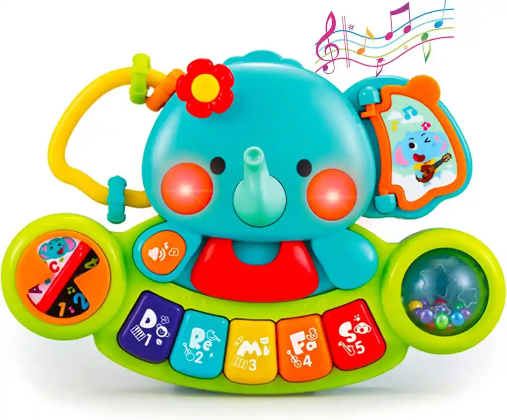 Juguete Musical Educativo Elefante con Luz y Sonido Incluye: 1 piano musical en forma de elefante Este adorable elefante musical está diseñado para estimular el aprendizaje temprano a través de luces, sonidos y múltiples actividades interactivas que mantienen al bebé entretenido mientras explora, toca y juega. Características: - 2 modos de juego educativos: Modo Aprendizaje: Enseña números, sonidos de animales y voces de instrumentos musicales. Modo Música: Introduce la escala musical (Do, Re, Mi, Fa, Sol) con melodías alegres que desarrollan el ritmo y la percepción auditiva. - Desarrollo de habilidades motoras: Cuenta con 7 actividades interactivas que fortalecen la motricidad fina y la coordinación ojo-mano. - Seguro y de alta calidad: Fabricado en plástico ABS de alta calidad, con bordes redondeados, superficie lisa y materiales no tóxicos, totalmente seguro para bebés. - Ideal como regalo: Diseño colorido con asa para fácil transporte, perfecto para bebés de 6 a 24 meses. Ideal como regalo para cumpleaños, baby shower, Navidad y otras celebraciones.