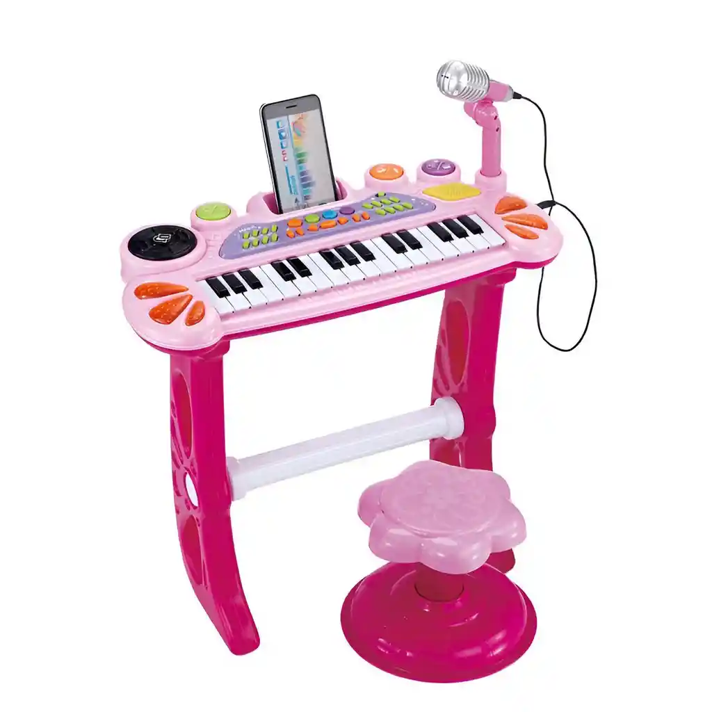 Divertido y colorido órgano electrónico infantil con 31 teclas, diseñado para estimular la creatividad musical y el aprendizaje de las niñas a partir de 3 años. Incluye micrófono con soporte, funciones musicales variadas y asiento en forma de flor para mayor comodidad durante el juego. Su diseño interactivo permite combinar el canto y la interpretación, fomentando la coordinación, la imaginación y el amor por la música en un entorno seguro y educativo. Ficha Técnica: Material : Plástico ABS , No toxico Edad Apto + 3 años Funcionamiento: Batería AA Incluidas Dimensiones: 64 cm x 52 cm x 35 cm Certificado de conformidad: E5-0359-2021 Referencia: HK-8158C ** _Para defectos de fábrica o retractos: \_Por favor revise el producto apenas lo reciba y antes de usarlo. No aplican ley de retracto o defectos de fábrica luego de usar el producto. Se manejan máximo 5 días para reportar defectos de fábrica (por ejemplo, producto funciona mal, piezas faltantes, rotas, etc). Para hacer efectiva la devolución el producto debe devolverse con el empaque original, el cual debe estar en buen estado, incluir todos los documentos y las partes completas y sin daños.