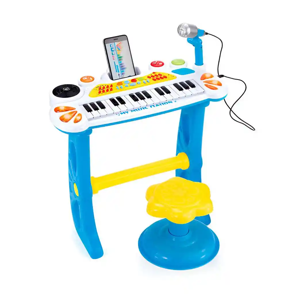 Divertido y colorido órgano electrónico infantil con 31 teclas, diseñado para estimular la creatividad musical y el aprendizaje de las niñas a partir de 3 años. Incluye micrófono con soporte, funciones musicales variadas y asiento en forma de flor para mayor comodidad durante el juego. Su diseño interactivo permite combinar el canto y la interpretación, fomentando la coordinación, la imaginación y el amor por la música en un entorno seguro y educativo. Ficha Técnica: Material : Plástico ABS , No toxico Edad Apto + 3 años Funcionamiento: Batería AA Incluidas Dimensiones: 64 cm x 52 cm x 35 cm Certificado de conformidad: E5-0359-2021 Referencia: HK-8158C ** _Para defectos de fábrica o retractos: \_Por favor revise el producto apenas lo reciba y antes de usarlo. No aplican ley de retracto o defectos de fábrica luego de usar el producto. Se manejan máximo 5 días para reportar defectos de fábrica (por ejemplo, producto funciona mal, piezas faltantes, rotas, etc). Para hacer efectiva la devolución el producto debe devolverse con el empaque original, el cual debe estar en buen estado, incluir todos los documentos y las partes completas y sin daños.