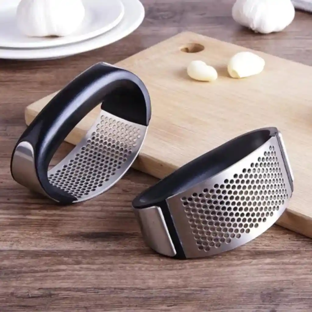 Generalmente fabricada en acero inoxidable de grado alimenticio (como el acero inoxidable 304), lo que le confiere durabilidad, resistencia a la oxidación y facilidad de limpieza. Cuenta con un diseño ergonómico, a menudo con un mango curvado para un agarre cómodo y un uso sencillo. Su estructura permite triturar ajos pelados e incluso jengibre pelado.